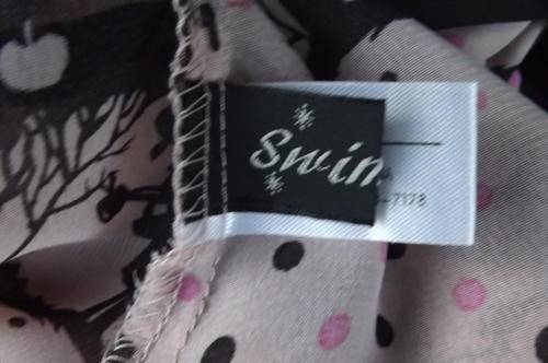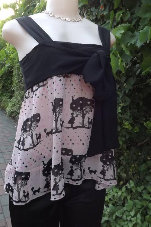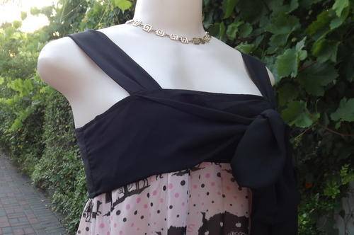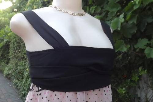 Edgy but playful dull pink top size 32/8 with black pattern dots and shoulder straps.100% Wash&wear polyester.Elastic at back.Long black bands to tie at front or back.As new