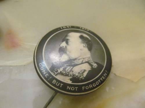 2)- A TIN LAPEL PIN WHICH DEPICTS A BLACK AND WHITE PORTRAIT OF KING EDWARD VII AND THE WORDING AROUND THE SIDES - "1841 - 1910, GONE ! BUT NOT FORGOTTEN" THE PIN HAS FAINT TRACES OF RUST AT THE BACK BUT NO DENTS OR OTHER DAMAGES ETC. IT IS NOT STAMPED. 3.4cm DIAMETER