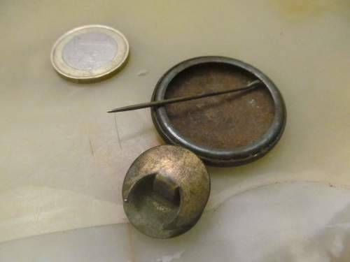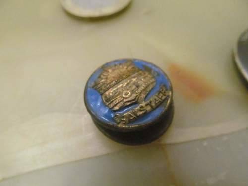 1)- A BRASS LAPEL BUTTON WITH BLUE ENAMEL AROUND A SHIELD DEPICTING A LOCOMOTIVE AND THE WORD "SALSTAFF" UNDERNEATH. A VERY TINY PIECE OF THE BLUE ENAMEL IS CHIPPED ON THE RIGHT SIDE OF THE LOCOMOTIVE ASIDE FROM WHICH THE ITEM REQUIRES POLISHING BUT HAS NO OTHER DAMAGES OF ANY KIND. IT IS NOT STAMPED. 1.8cm DIAMETER.....1.7cm FRONT TO BACK
