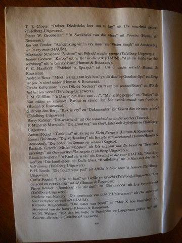Sagteband in goeie toestand. Vyfde, hersiene uitgawe, eerste druk 1996 met 616 bladsye. Binding is stewig en die boek is skoon binne. Rakskaafmerke sigbaar. Die laaste klompie bladsye, asook die agterblad, het waarskynlik nat gekry, maar daar is geen sigbare watermerk nie. 'n Lekkerlees-kopie. Posgeld in RSA = R26.00