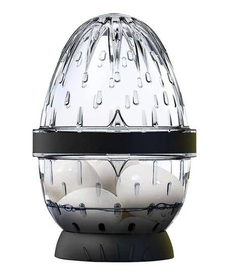 Egg Stripper Multi-Egg Shell Peeler Potato salad. Deviled eggs. Cobb salad. So delicious ... but peeling eggs is so time consuming. With the Egg Stripper, it doesn't have to be. Peel up to five hard-boiled eggs at a time in under 10 seconds. Simply place your cooked eggs in the base, add some water, shake and watch the shells slide right off. The clear container makes it easy to see the action, and the soft base prevents it from slipping on your countertop. The top and bottom even nest inside each other for easy storage, making this multi-functional tool a space-saver, too.
