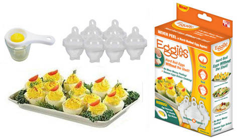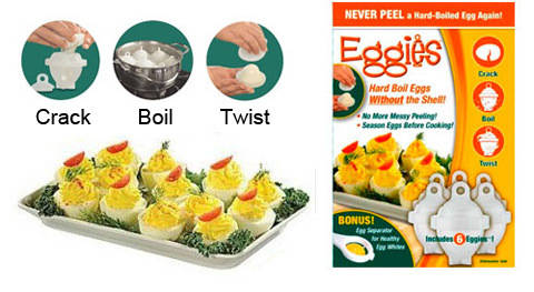 Eggies Hard-Boiled Egg Cooking Capsules eliminate the messy peeling associated with hard boiling eggs. All you have to do is crack the egg, place it in the capsule and boil it as you normally would. When the egg is done boiling, just twist the capsule, and your egg comes out shell-less and perfect every time!