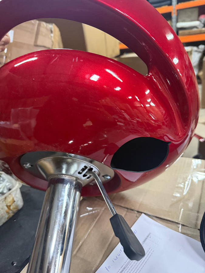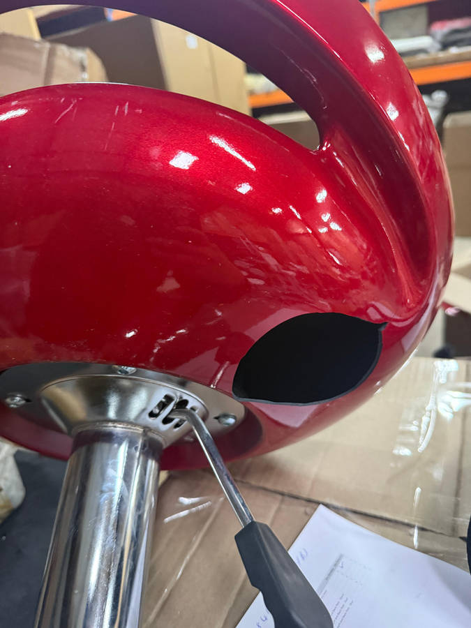 PLEASE NOTE THAT THE STOOL IS IN EXCELLENT NEW CONDITION BUT AS SHOWN IN THE PHOTO IT HAS A ROUND HOLD UNDERNEATH IT. THE WHOLE IS NOT VISIBLE UNLESS YOU PICK UP THE STOOL AND ALSO IT DOES NOT AFFECT THE USAGE OF THE STOOL.