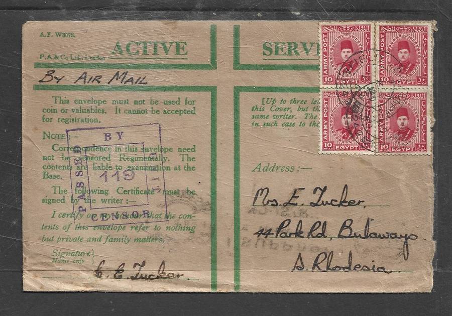 Egypt, 1940 Army Post 10m (4), FIELD POST OFFICE 242 > BULAWAYO Rhodesia