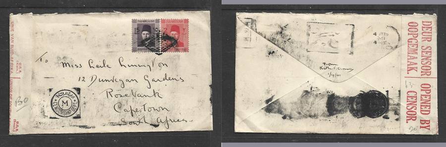 Egypt, 1941, 17 mills, envelope, retta cancel, CAIRO 4 FEB 11941 transit > S. Africa