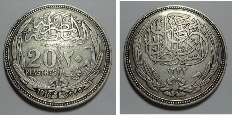 Egypt: Silver Crown-size 20-Piastres of 1916