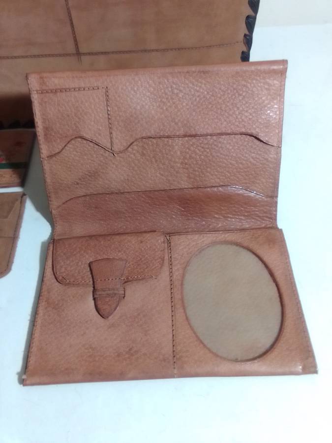 Handbag from Egypt, Hand tooled and has the same scenes on both Handbag and Wallet + 2 purses. All the ZIP's work and it's Beautifully made and crafted. made in the 50s to 60s. The handbag is in great condition with Pockets for items and a coin purse and a stamp purse plus a Wallet with a lot of compartments. Has been in storage for years. Sold as good used secondhand.