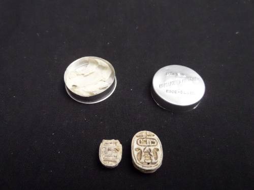 I bought these item a couple of years ago out of a Jewish gentleman estate They where worn to represent God Khepri-He was the God of Sunrise Was believed to have pushed the sun each morning into the sky then back down to the underworld in the evening The Scarab's habit of rolling a ball of mud or dung along the ground Egyptians interpreted it as being similar to the ball moving across the sky daily Meaning -transformation and protection PLEASE NOTE THESE ITEMS ARE VERY SMALL (the tin is the size of a small pill holder Welcome to combine item These are really very interesting items with a certificate see pics