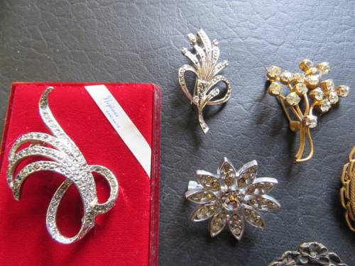 Eight vintage costume brooches as one lot. There are one or two little stones missing. Still Pretty. Postage R 65.00.