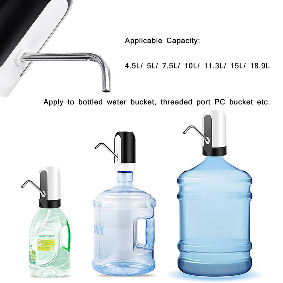 Specifications: - Type: Electric Water Pump - Material: ABS + 304 Stainless Steel - Power: USB Charging - Rated Power: 5W - Rated Frequency: 50Hz - Rated Voltage: 5V - Colour: Black & White - Size: 13.3*7.3cm/ 5.2 x 2.9/ Dia x H - Gross Weight: 347g - Applicable Capacity: 4.5L/ 5L/ 7.5L/ 10L/ 11.3L/ 15L/ 18.9L - Apply to bottled water bucket, threaded port PC bucket etc. Features: - Plug and play - Compact and portable - easy to carry - LED glowing - Made from ABS material, this productas hull is abrasion resistance and heat resistance. - Adopting food grade material - silicone - One button to water - USB interface is convenient for charging - Detachable soft pipe (made from food grade material - silicone ) Package Included: 1 x Automatic Electric Water Pump 1 x Outlet Pipe 1 x Inlet Pipe 1 x USB Cable