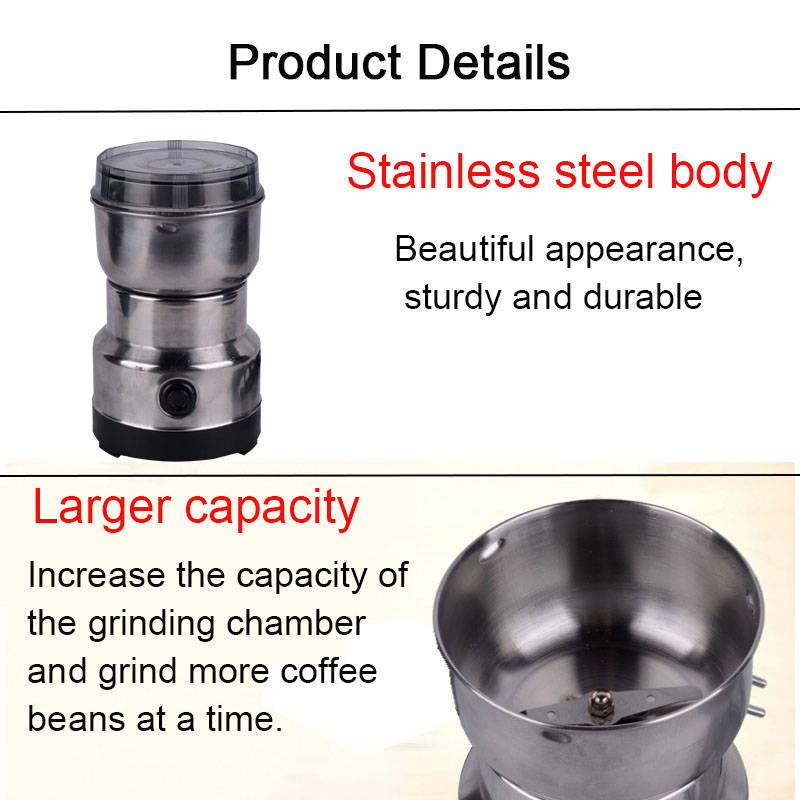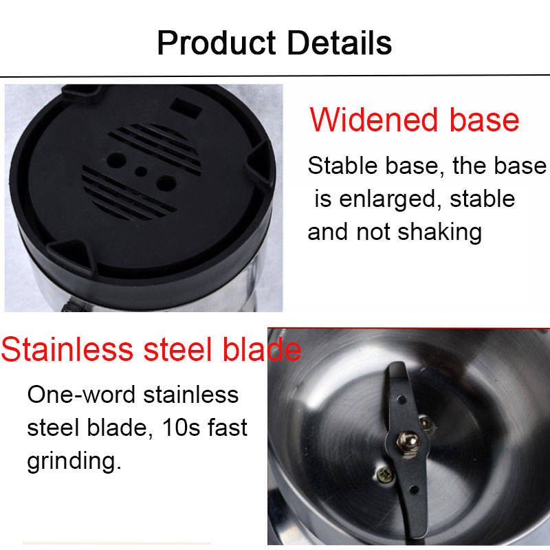 2. Stable Base, The Base Area Of The Fuselage Is Enlarged, Stable And Not Shaking. 3. It Can Grind A Variety Of Ingredients, Not Only Coffee Beans, But Also Grind Cereals, Nuts, Spices, Ingredients, Medicines, Etc. 4. One-word Stainless Steel Blade, 10s Fast Grinding. 5. Increase The Capacity Of The Grinding Chamber, And Grind More Coffee Beans At A Time.