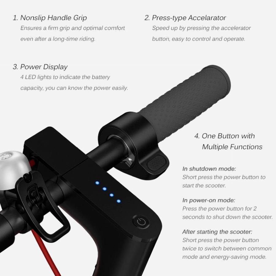 Practical handle: with anti-slip handlebar, power remain indicator, power button, bell, brake, accelerator
