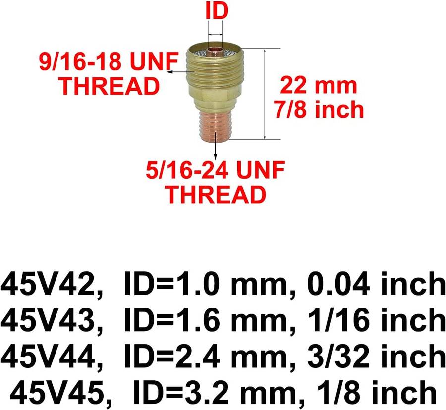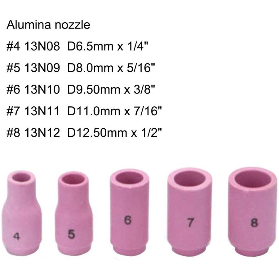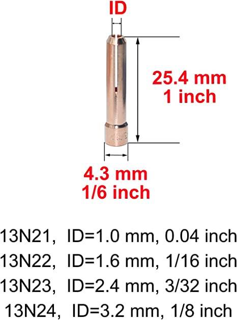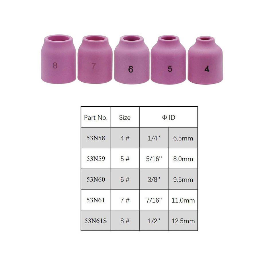 1 PC 53N58 #4 Ceramic Cup1 PC 53N59 #5 Ceramic Cup1 PC 53N60 #6 Ceramic Cup1 PC 53N61 #7 Ceramic Cup1 PC 53N61S #8 Ceramic Cup1 PC 13N08 #4 Ceramic Cup1 PC 13N09 #5 Ceramic Cup1 PC 13N10 #6 Ceramic Cup1 PC 13N11 #7 Ceramic Cup1 PC 13N12 #8 Ceramic Cup2 PC 13N21 Collet 1.0mm2 PC 13N22 Collet 1.6mm2 PC 13N23 Collet 2.4mm2 PC 13N24 Collet 3.2mm1 PC 13N26 Collet body 1.0mm1 PC 13N27 Collet body 1.6mm1 PC 13N28 Collet body 2.4mm1 PC 13N29 Collet body 3.2mm1 PC 45V42 Gas Lens 1.0mm1 PC 45V43 Gas Lens 1.6mm1 PC 45V44 Gas Lens 2.4mm1 PC 45V45 Gas Lens 3.2mm1 PC 41V24 Long Back Cap1 PC 41V33 Short Back Cap1 PC 41V35 Medium Back Cap2 PC 598882 Gasket