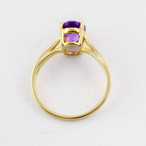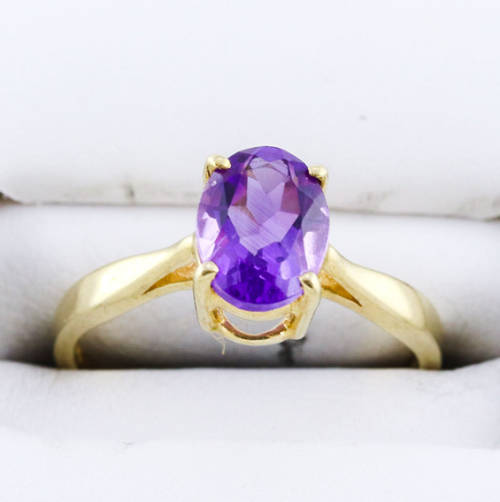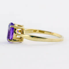 This elegant solitaire piece features an oval-faceted amethyst of a particularly beautiful strong purple colour , claw set in 10ct yellow gold. The shank is simple polished gold, forking horizontally to support the elongated claws that hold the amethyst solitaire 5,5 mm above the finger. Openwork below the gemstone allows the light through. The pedigree of the piece is evident in the many hallmarks: the jeweller's signature, the Birmingham Assay mark, hallmarks for both 9ct yellow gold (375) and for 10k gold. The jeweller has used both. It bears the date hallmark for 2014 and is in excellent condition with no flaws or even buff marks to speak of. The ring head measures 7mm long x 4mm wide, and weighs 1,6 grams. it is a size 7 (O in British and SA sizing). A beautiful and simple piece with lovely strong colours. The ring comes with an independent Jeweller authentication and Valuation Certificate of R6'000.