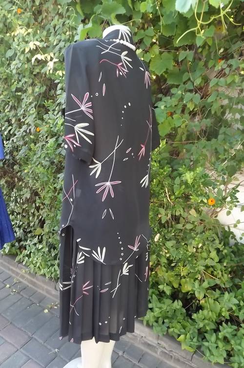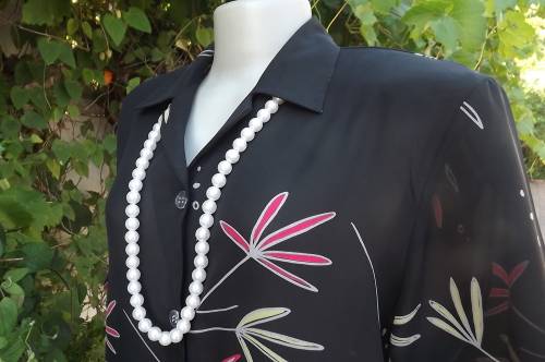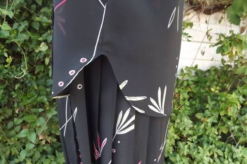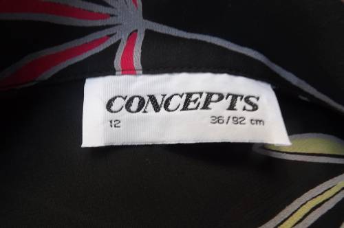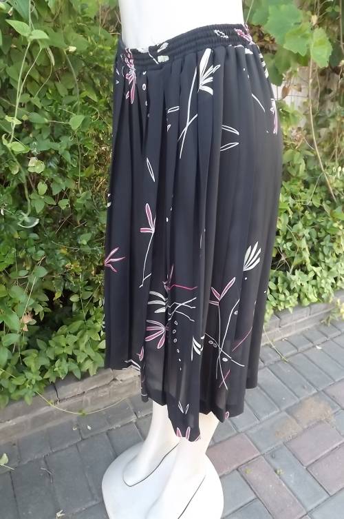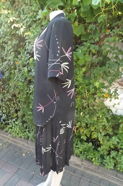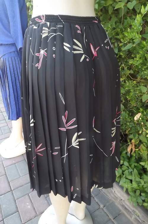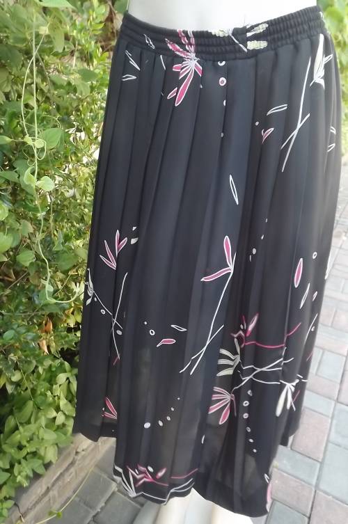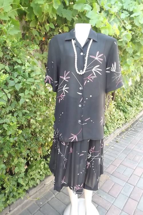 Elegant 2 piece black skirt suite with permanent pleated skirt and elasticated middle.Size 36/12 by CONCEPTS. Button down top with open collar and short sleeves.Can also wear as seperates. Interesting red and yellow floral pattern.As new.Polyester W + W