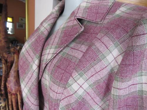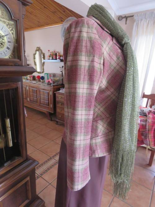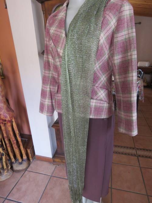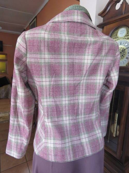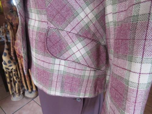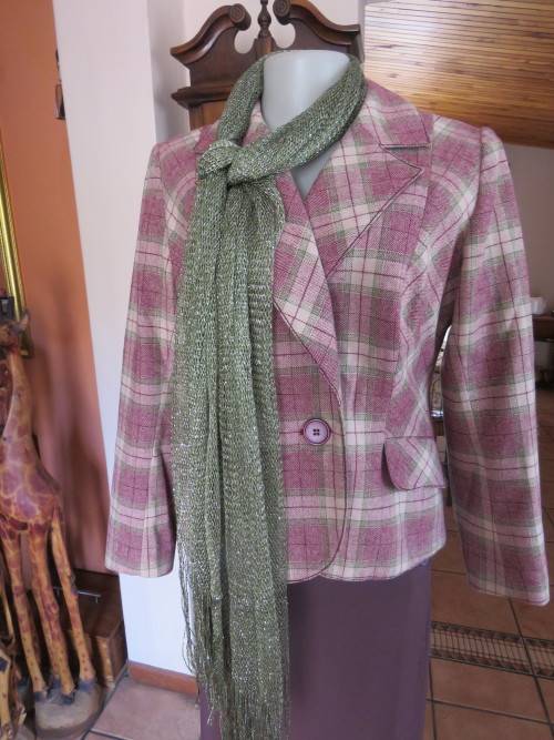 Elegant 38/14 check jacket by 'TRUWORTHS' in green,burgundy and cream.Fully lined.Close with 1 button on front.Two front pockets.Wide open collar.Contains 45% wool.New condition.