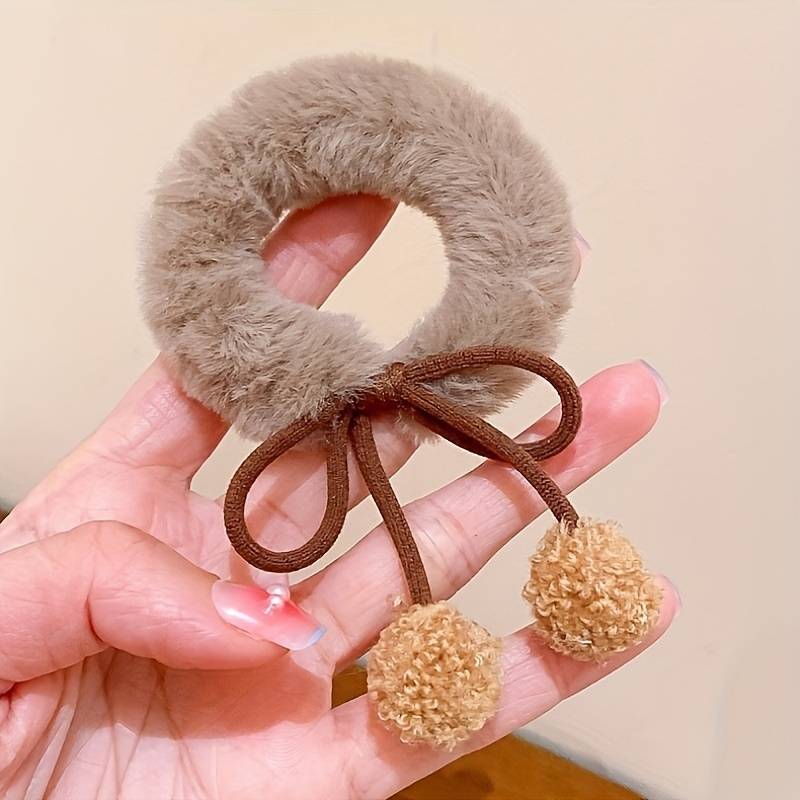 2 Pieces Plush Pom Pom Headband Set, Cute Sweet Style Solid Color Headband, Soft Khaki and Beige Elastic Headband with Bow and Decorations, Suitable for Women and Teens