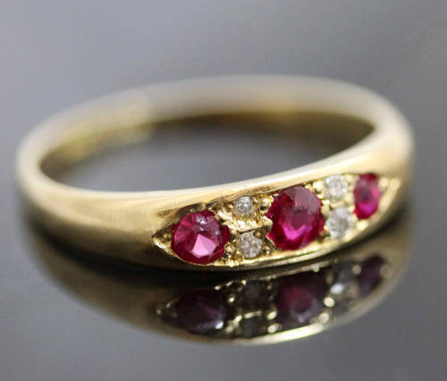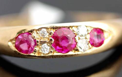A beautiful antique ring, this piece is 100 years old, hallmarked 1916. I would love to know the story behind this piece but research tells us that half-eternity rings - particularly those featuring rubies to represent matters of the heart - were popular as tokens of love to be given to a lady by her husband or boyfriend on his way to the front during the First World War. It is beautifully made, with 3 round cut rubies totalling 0,16 carats, separated by yellow gold spacers that have been set with 4 x 1,3mm diamonds, one above the other. The colour combination is striking, the rubies - a strong pinkish colour - diamonds and yellow gold really beautiful on the finger. The ring bears the hallmarks for 18ct gold (750) and the Birmingham assay and the date mark for 1916. There are some minor buff marks and the gold shank is fairly slender at the back, but considering it's age it is in really good condition. This piece has been jeweller authenticated and valued at R 8'604,00 but its worth mentioning that he only values the gold and gemstones. It is almost impossible to evaluate jewellery for its age, collectability or historic value!