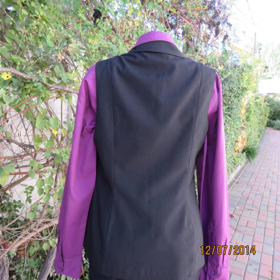 Elegant black sleeveless fully lined jacket. Front dummy pockets. With 3 button closure. Open notched collar. In polyester/viscose blend with some stretch. By OASIS size 38/14. Brand new condition.