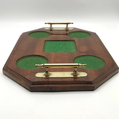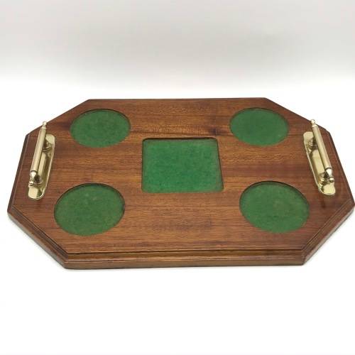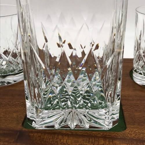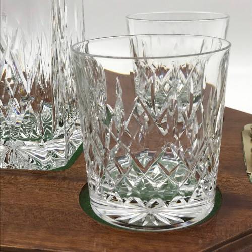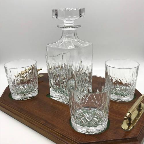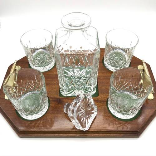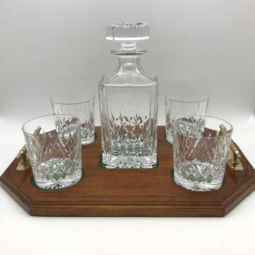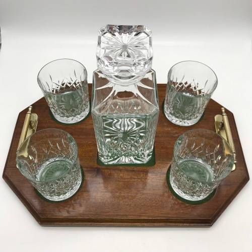 This very good quality, elegant, vintage crystal whiskey set comprises of a beautifully cut, crystal spirit decanter with stopper, four cut-crystal whisky glasses and a custom-made wooden mahogany tray with solid brass handles. The decanter and glasses are cut in the same elegant design, and all with star-cut bases. The wooden tray has green felt lined, shallow cut spaces for the glasses and decanter, as well as a green felt lined base. Although the set is pre-owned, it is in fantastic condition and appears to have hardly been used and would make an ideal gift for a whisky lover. The decanter measures 9cm x 9cm, stands 22,3cm high (18,5cm without stopper) and weighs 1470g. The glasses stand 9cm high with a top diameter of 8cm and the tray measures 42cm x 29cm, with a wood thickness of 2cm and with the brass handles, has a height of 5cm. Together the entire set weighs 4,6kg.