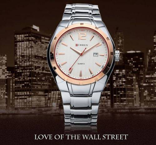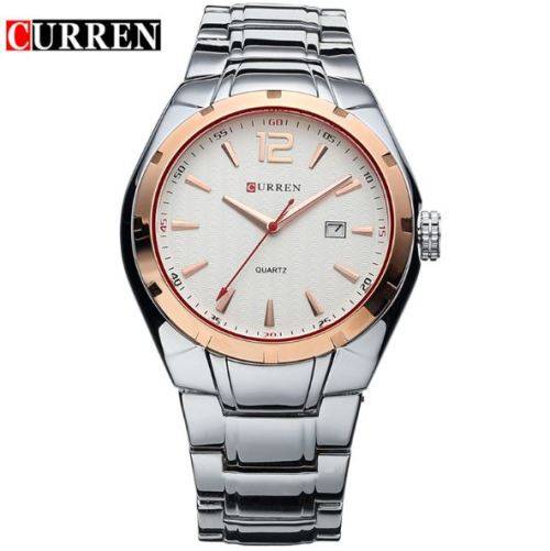 Elegant CURREN AUTO DATE Mens Quartz Wrist Watch With Stainless Steel Strap - Silver, Gold & White