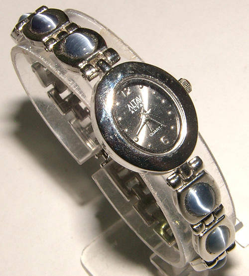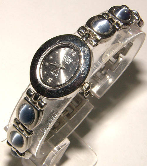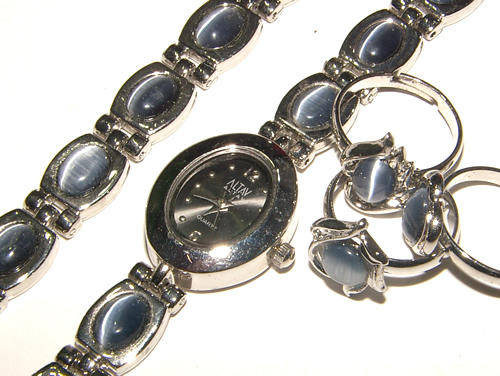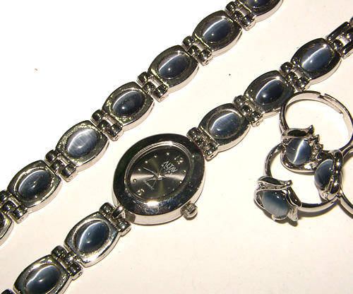 OVAL METALLIC FACE WITH SILVER HANDS AND MARKERS POLISHED SILVER TONE BEZEL ADJUSTABLE SILVER BAND WITH CAT'S EYE BEZEL SIZE - 23mm STAINLESS STEEL BACK PLUS MATCHING BRACELET AND RINGS!