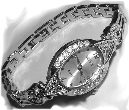 SILVER HANDS AND MARKERS POLISHED SILVER TONE BEZEL WITH WHITE CRYSTALS ADJUSTABLE SILVER BAND WITH WHITE CRYSTALS WILL FIT ANY SIZE BEZEL SIZE - 34mm STAINLESS STEEL BACK WATER RESISTANT