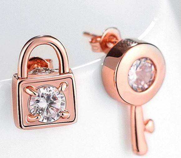 Elegant Rosegold Lock & Key Earrings with Cubic Zirconia Stones by Roxi