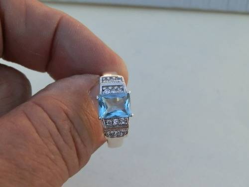 Stylish sterling silver ring with a blue stone and clear stone accent, marked 925 and in a good condition. The size is N / 7, top width 8 mm and the weight 4.4 g. The size of the blue stone is 8 x 6 mm. Fabulous!!