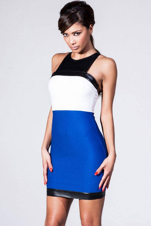 ELEGANT TWO TONE LEATHERETTE SPLICED BODYCON DRESS