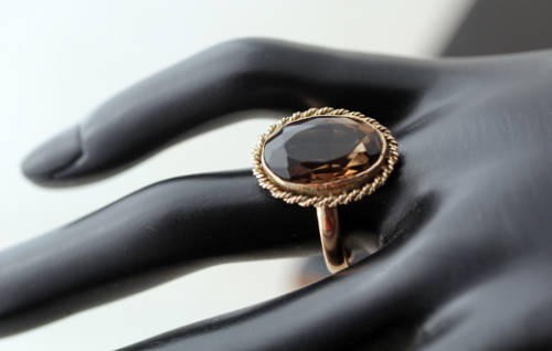 This classic vintage piece features a beautifully faceted x carat smokey quartz in a bezel setting, raised 6mm above the finger. The vintage piece has slim 9ct rose gold shank that supports the 19mm x 14mm ring head. The jeweller has allowed light to catch the facets of the gemstone by leaving openwork underneath the ring head. The colour is warm and alive, filled with fire. A lovely feature is the twisted rope design in the frame around the bezel setting. The ring head is more of a yellow than the shank. The ring is in good condition and is well-pedigreed with the '375' hallmark indicating 9ct gold, the jeweller's signature and the Birmingham Assay mark. It also has the date mark for 1928 making it a wonderful piece of history. The piece has been authenticated and certified by an independent jeweller. Heavy at 4.73 grams, the ring shank itself is particularly solid. It is flat on the inside and rounded on the outside. The ring head is quite large at 19mm long x 14mm across so it is a substantial ring but it lies nice and flat on the finger. The colours are beautiful - rose gold always adds interest to vintage pieces and colours work well with the warm brown smokey quartz. She turns 90 years next year ... but her condition is excellent! Its a particularly elegant and special collectable piece of vintage England.