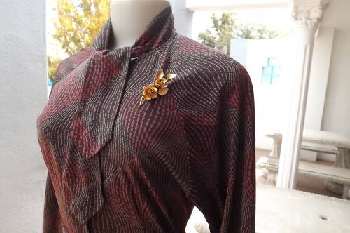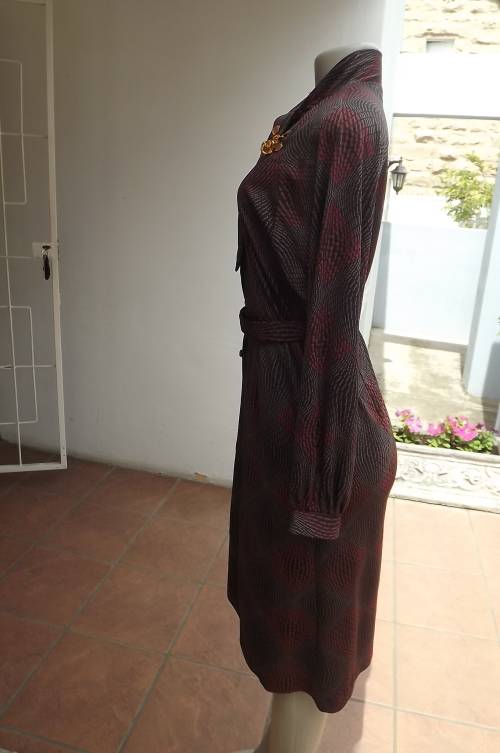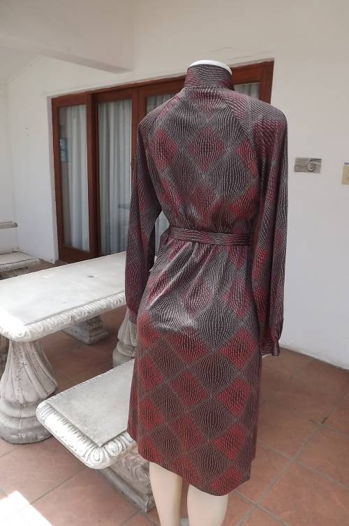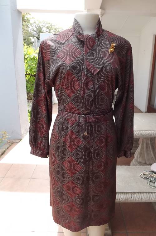 Elegant vintage dress by Q+F in brown and red graphic pattern.Size 34/10.In wash + wear polyester.Long cuffed sleeves.Button down halfway pussy bow neckline with fabric belt.New condition