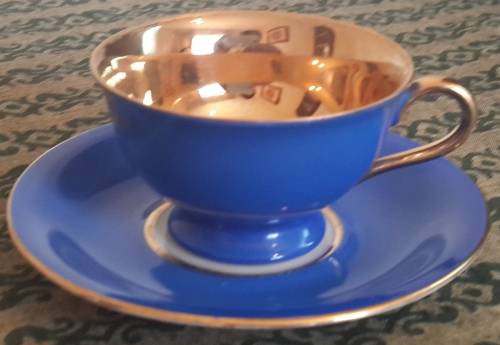 A striking demitasse tea duo from the Bavarian company, Elfenbein. This Art Deco design is simplicity itself: The outside of the cup and inside of the saucer are coloured bright blue with gilded rims. The inside of the cup and its handle are richly gilded. The backstamp dates the manufacture of this duo to the period 1935 to 1950.