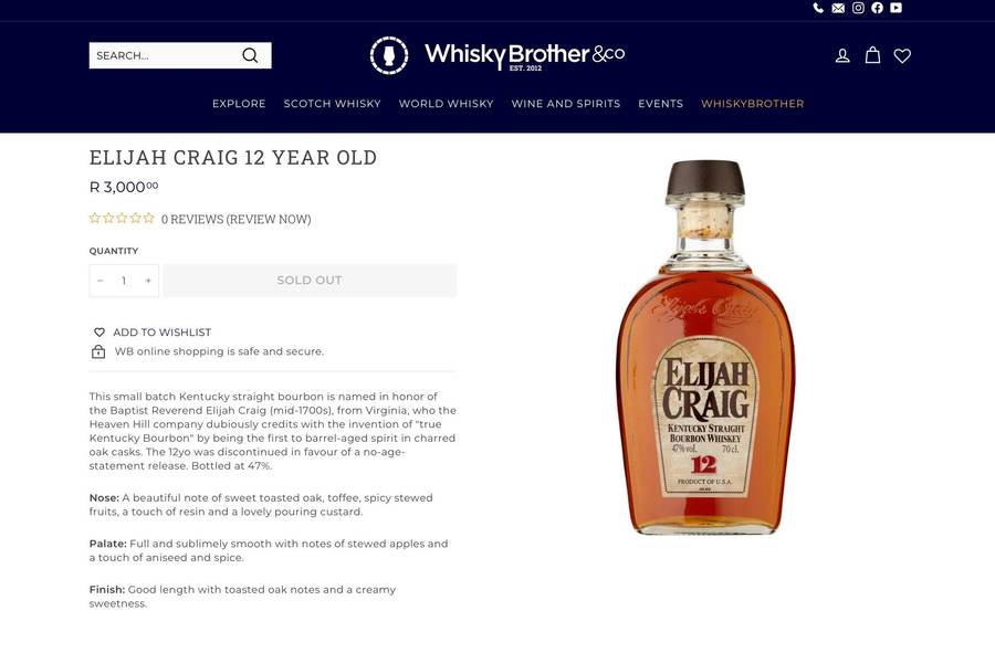 THIS ELIJAH CRAIG 12 YEAR WAS DISCONTINUED IN 2016 WITH NO FURTHER PRODUCTION WHICH INCREASED ITS VALUE & COLLECTABILITY SIGNIFICANTLY AS YOU CANNOT JUST BUY AND IF YOU DO FIND - IT SELLS FOR OVER R3000. THE DISTILLERY WILL NEVER MAKE THIS 12 YEAR AGAIN- A RARE PIECE OF HISTORY