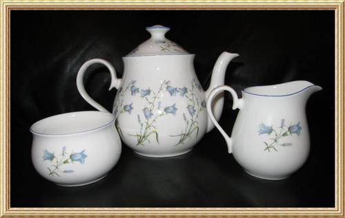 A beautiful blue rimmed Elizaberthan Staffordshire fine bone China " Moorland " Lidded Tea Pot / Milk Jug / Open Sugar Bowl, with lovely blue bells flowers, in good condition, Tea Pot 14cm height, 18cm width, milk jug 8.5cm height, open sugar bowl 5.5cm height, 7.5cm diameter.