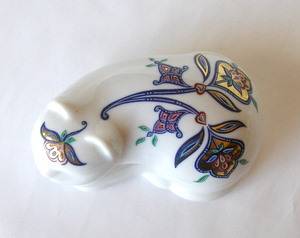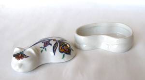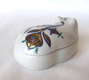 An Elizabeth Arden trinket box shaped as a cat, from the Byzantium range. It is decorated with a stylised pattern in blue, red, green and gold.