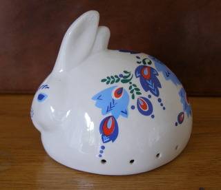 An Elizabeth Arden pot-pourri/bath salts jar in the shape of a rabbit, from the Orient Express range. It is decorated with a stylised blue flowers with red centres, and some dark green leaf swirls.