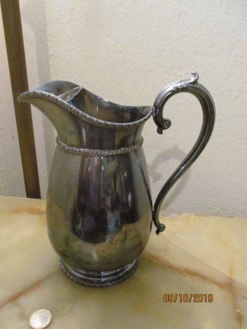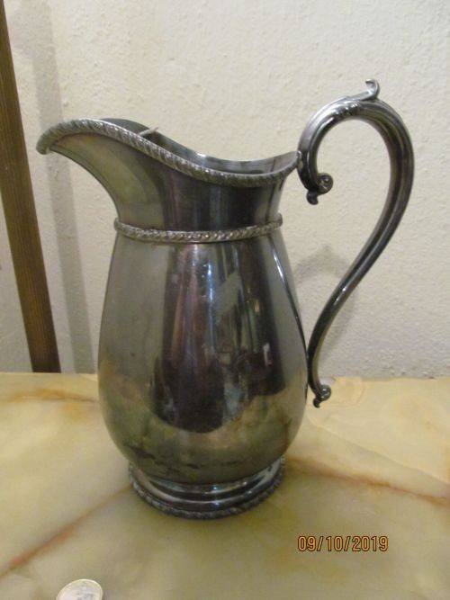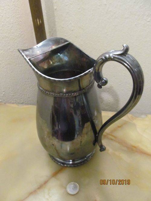 THIS MAGNIFICENT ITEM HAS A STURDY YET GRACIOUS APPEARANCE WHILE BEING GRANDLY PROMINENT WHEREVER THE ITEM IS PLACED OR UTILIZED DUE TO ITS LOVELY ELIZABETHAN STYLE. A VINTAGE SILVER PLATED CLARET JUG / WATER PITCHER WHICH IS DESIGNED WITH A GRADUATED TRUMPET SHAPED BASE AND HAS AN ORNATE AND STURDY SCROLL HANDLE AS WELL AS AN ICE LIP ATTACHED ACROSS THE SPOUT. THE BASE, NECK AND RIM HAVE BEEN ENHANCED BY THE PRESENCE OF AN EMBOSSED RIBBED MOTIF.