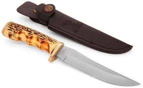 This is the new Elk Ridge Simulated Bone Bowie hunting knife. It measures 8 7/8" (22.5cm) overall. The 440 stainless steel clip point blade is 4 7/8" (12.4cm) long and etched with the Elk Ridge logo. The handle is simulated bone with finger grooves and brass guard and pommel. Comes with black leather belt sheath. Imported. Brand new in box.