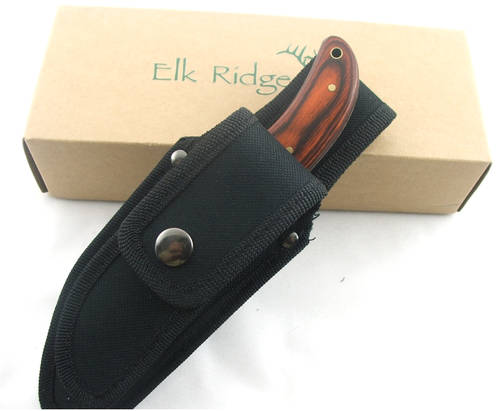 Elk Ridge Two Piece Hunting Set. Includes an 8" overall guthook hunter with 3 1/2" blade and a 4 1/2" closed companion linerlock. Both feature stainless blades and laminated wood handles with lanyard hole. Black nylon belt sheath holds both. Brand new in box.