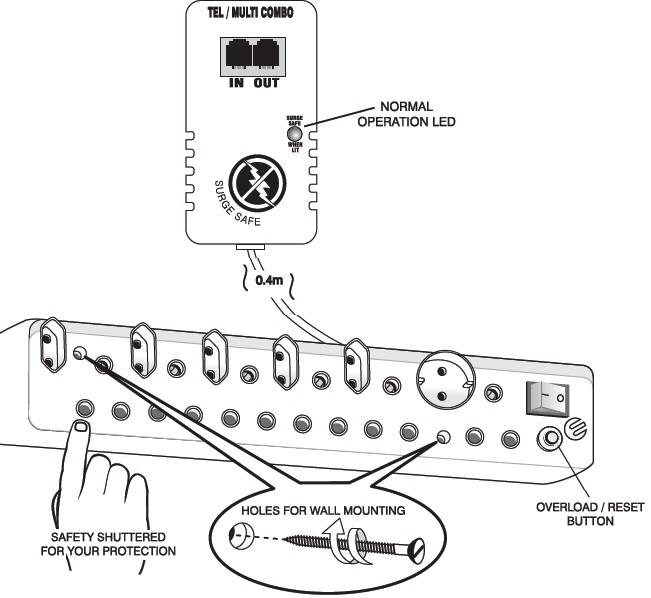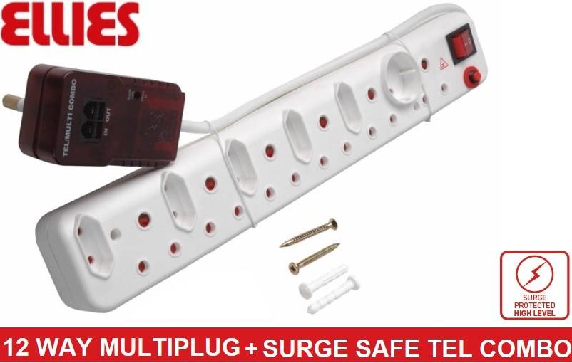Product Overview The Ellies 12-Way Multi-Plug with High Surge Protection is ideal for medium duty applications and indoor use that converts your single plug point in to multiple sockets to provide power and protection for up to 12 appliances including a Schuko socket. This high surge protected 12 way MultiPlugs has 5 x 2 pin Euro slots, 1 x 2 pin Schuko socket and 6 x 3 pin sockets. The extension cord allows you to extend your reach by 0.4m.The Surge Safe Tel Combo unit protects your telephone lines in case of a surge. it also has Built-in safety shutters that act as a preventative measure against children inserting fingers or objects into plug sockets and blocks out dust and debris when the outlets are not in use . The surge protection protects your equipment from damaging surges and spikes.
