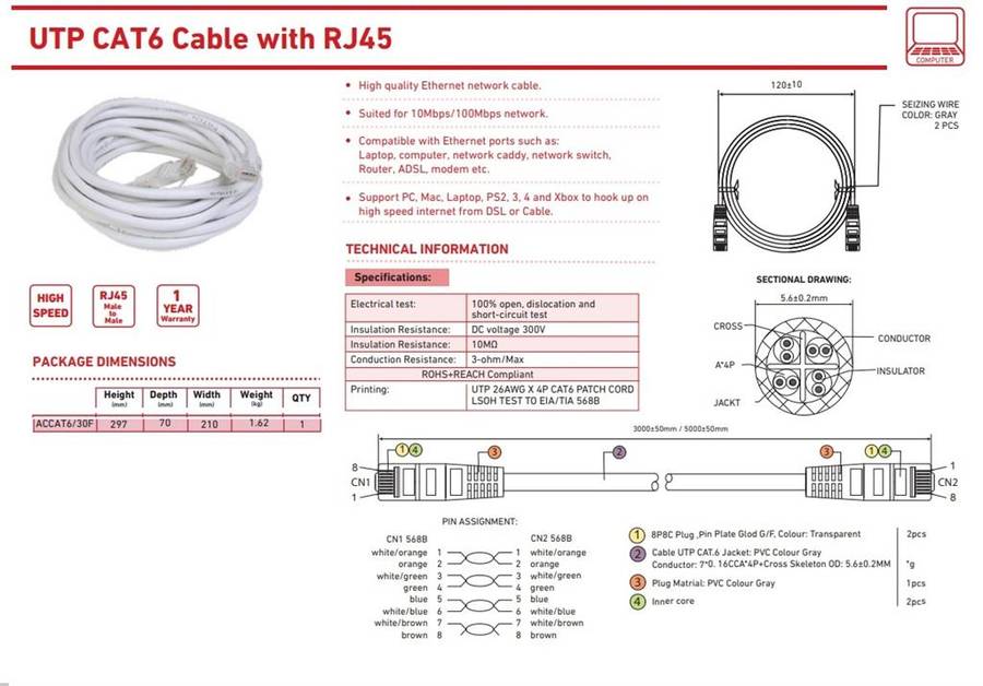 The Ellies UTP Ethernet CAT6 Cable With RJ45 Connectors 30 Metre Length is high quality network cable that is suited to 10Mbps/100Mbps Network applications , it compatible with Ethernet Ports on Laptops, Computers, Network Caddies, Network Switches, Routers, ADSL And Modems, Smart TV's and media boxes , Support PC, Mac, Laptop, PS2, 3, 4, 5 And Xbox To Hook Up With High-Speed Internet From DSL Or Cable