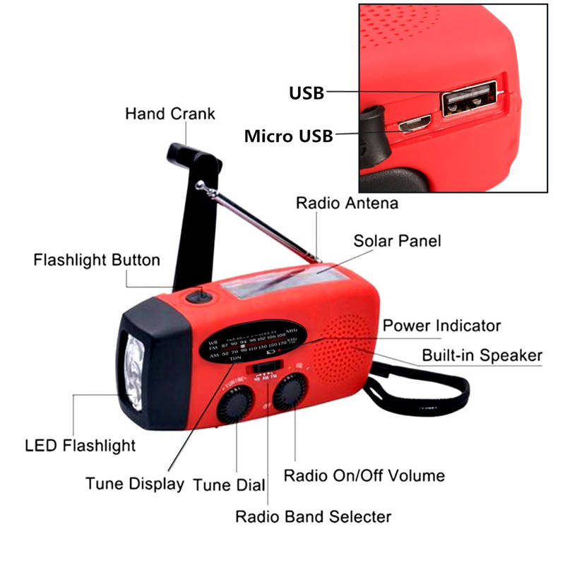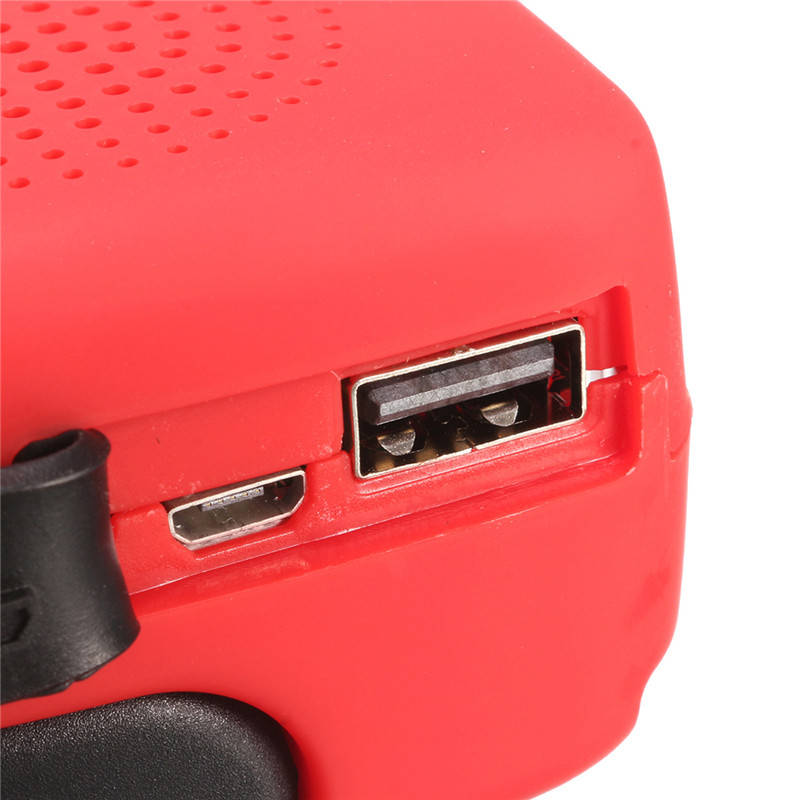 5. Multiple ways to power/ charge the radio: hand crank to wind up internal alternator, expose to sunlight, DC recharge by USB cable