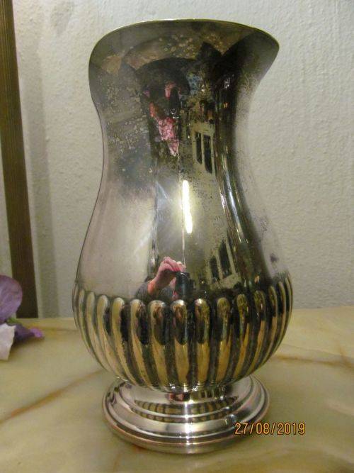 CONDITION : A VERY SMALL DENT IS SITUATED ON THE FRONT LEFT ABOVE THE RIBBED MOTIF AND THE SILVER PLATE IS BEGINNING TO FADE WITH AGE RESULTING IN A BRASS GLOW TO PORTIONS. ASIDE FROM THIS THE JUG / PITCHER IS IN PERFECT CONDITION HAVING NO OTHER DENTS, NO DAMAGES, RUST ETC