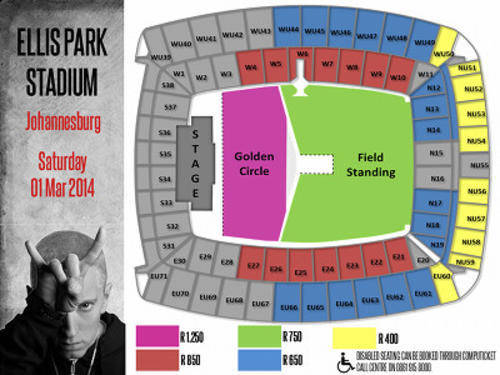 EMINEM is bringing his Rapture 2014 tour to Johannesburg`s legendary Ellis Park Stadium on Saturday 1 March 2014. This is Eminem`s first visit to South Africa and the African continent. It is possible also his last tour of this magnitude and not to be missed.