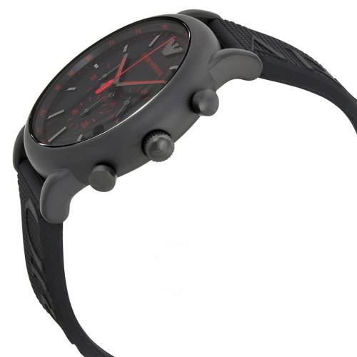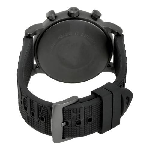Black stainless steel case with a black silicone strap. Fixed black stainless steel bezel. Black dial with luminous silver-tone hands and index hour markers. Minute markers. Tachymeter markings around the outer rim. The Emporio Armani logo appears at the 12 o'clock position. Dial Type: Analog. Luminescent hands and markers. Date display between the 4 and 5 o'clock positions. Chronograph - three sub-dials displaying: 60 second, 30 minute and 24 hours. Quartz movement. Scratch resistant mineral crystal. Pull / push crown. Solid case back. Round case shape. Case size: 46 mm. Case thickness: 8 mm. Band width: 14 mm. Tang clasp. Water resistant at 50 meters / 165 feet. Functions: chronograph, tachymeter, date, hour, minute, second. Dress watch style. Armani Luigi Chronograph Black Dial Mens Watch AR11024.