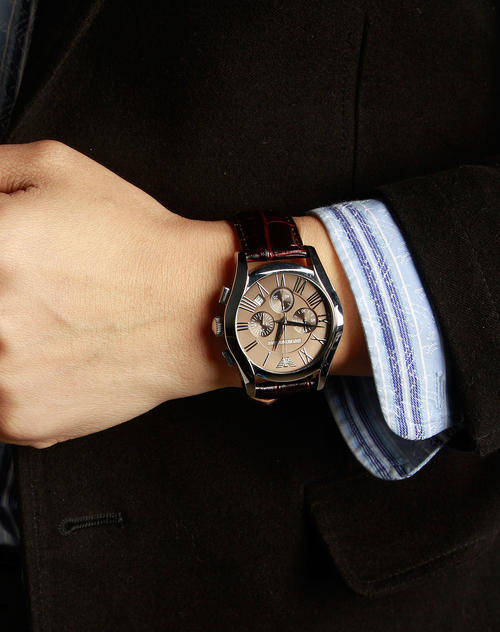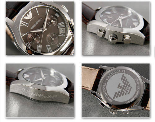 Versatile and reliable Emporio Armani watch. Leather bracelet and round case. Chronograph function, date window, logo and three sub-dials. Quartz movement.
