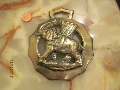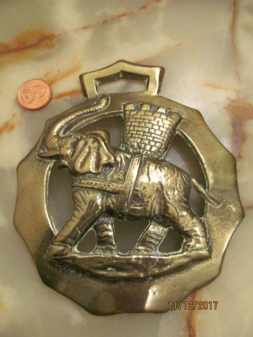 THIS BEAUTIFUL SOLID BRASS ITEM IS A VINTAGE HORSE BRASS DEPICTING AN ELEPHANT. THE ITEM IS LARGER THAN THE AVERAGE ONES AND HAS A LOVELY SCALLOPED EDGE. IT IS COLLECTABLE, DECORATIVE AS WELL AS ORNAMENTAL