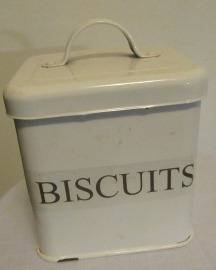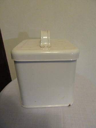 Enamel square biscuit container with lid in white with grey print the container is 19cm high x 12.5cm.