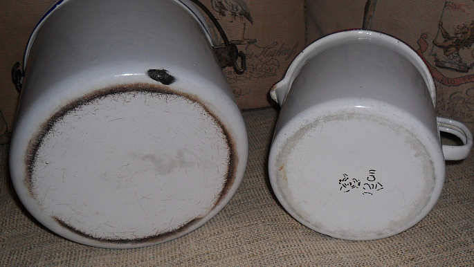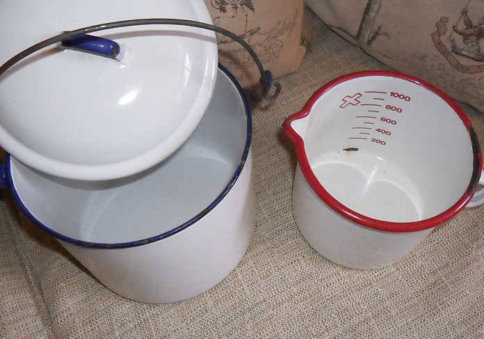 ENAMEL JUG AND MILK BUCKET WITH WIRE HANDLE - JUG PLUS LID -WHITE WITH RED TRIM - MEASURES - HEIGHT 11.5CM X 13,5 CM ---- MILK BUCKET -WHITE WITH BLUE TRIM - MEASURES - HEIGHT 15CM X 16,5 CM - PLEASE VIEW PHOTOGRAPHS FOR CONDITION - POSTAGE R 38